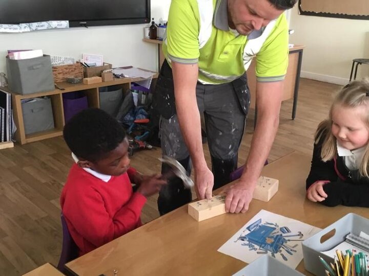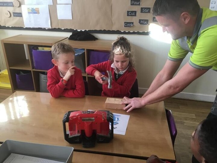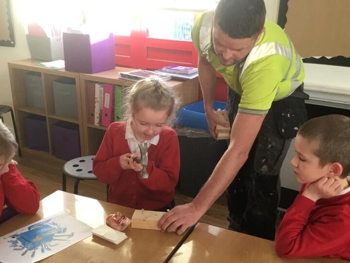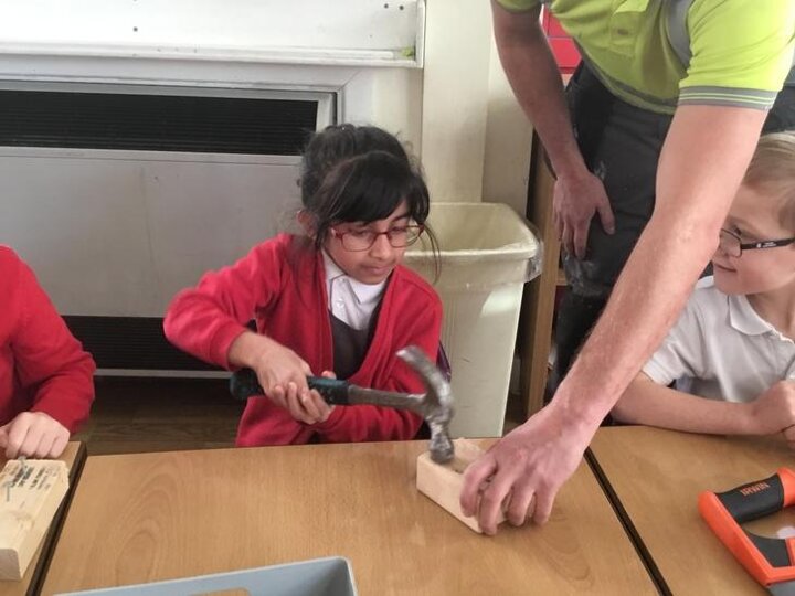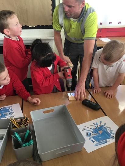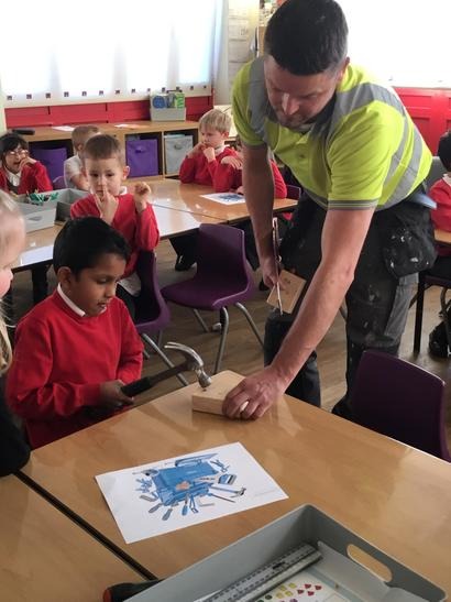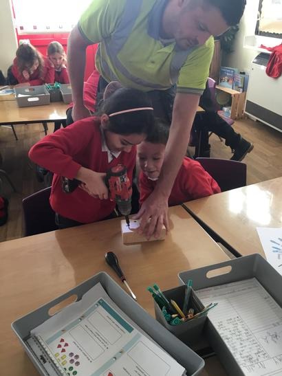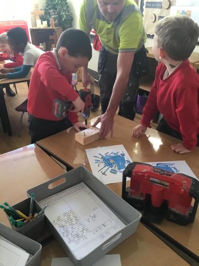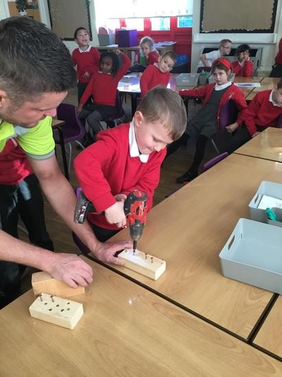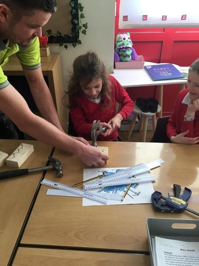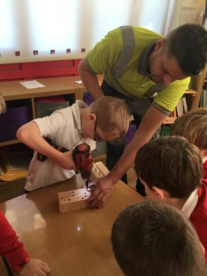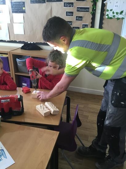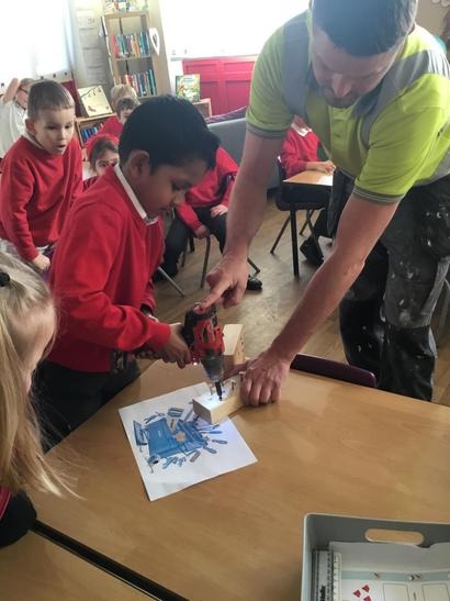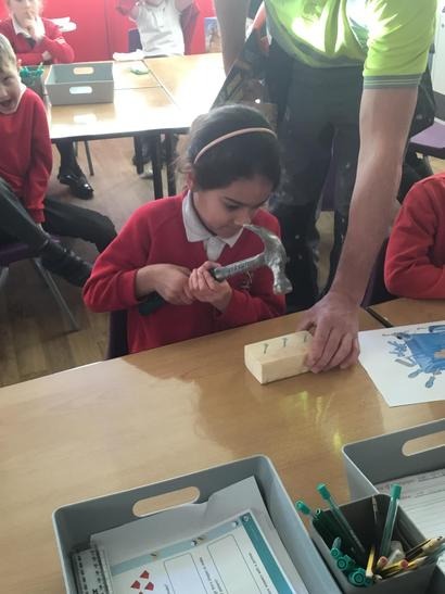 Micheal told us about his job and how he constructs different things, we also had the opportunity to ask him questions about his tools and his job. We also had the experience of being a builder by hammering some nails into some pieces of wood and we also drilled some screws into pieces of wood.