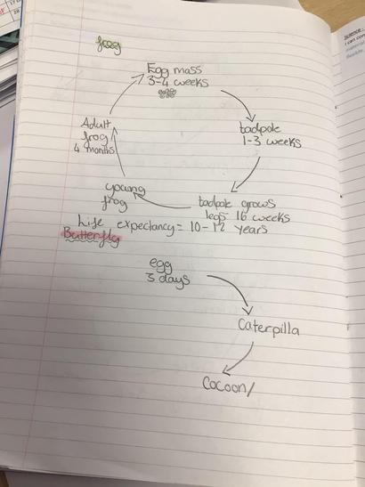 After we had completed our research and note taking, we then turned this research into a life cycle. We showed how the cycle goes round in stages like we did in our notes. We were then able to compare the different life cycles of each one - looking in detail at how the time span for the different one changes depending on if it is a mammal, an insect, a bird or an amphibian.