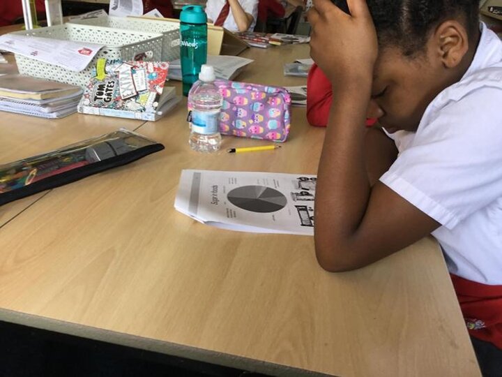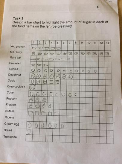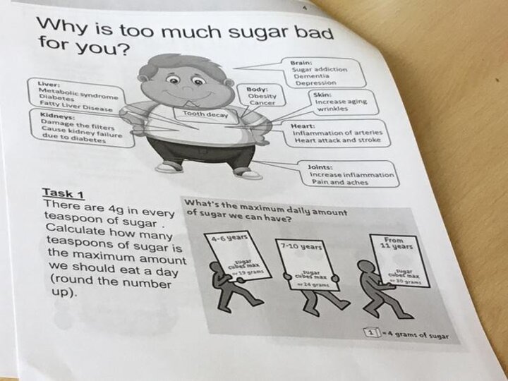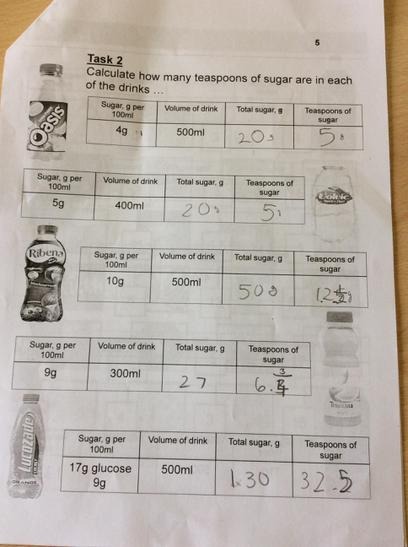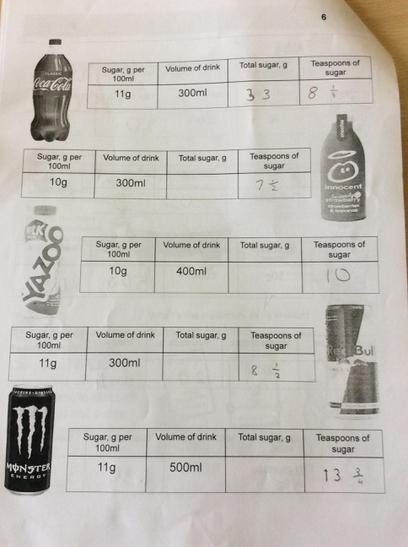 oday we had a visit from Sian. She told us all about how much sugar we should have in a day. (6 teaspoons daily). This really isn't a lot. At the start Sian gave us a booklet to complete called Rethink your drink!. I thought that what I had to drink every day was healthy, but then I wasn't prepared for the hidden sugars or just how much sugar there was in a drink. Did you know that Oasis citrus drink for every 500ml has 5 teaspoons of sugar, which means that is almost my daily allowance in one drink. My friends and I drink water at school and at home we have Volvic with a touch of fruit for flavour, however today we learned that every 400ml of water contains 5 teaspoons of sugar.