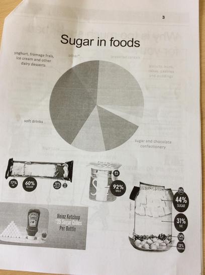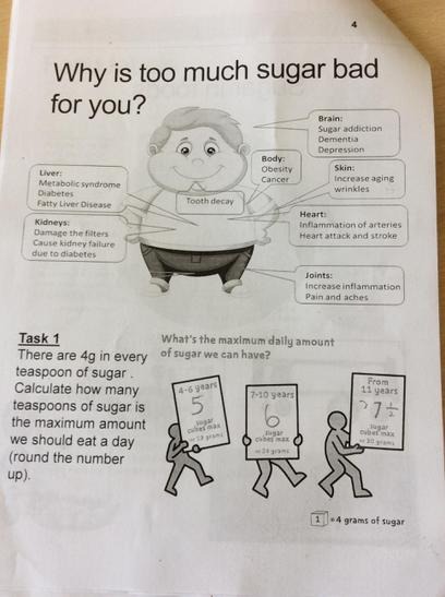 Today Sian came to visit our school again. In our class she talked about the body and our organs. We had some understanding about our organs because we had been on the Life Bus with Susan and she explained the function of most of our organs. Sian showed us a big piece of fat and explained how that fat in our bodies can make our organs have to work much harder. We thought the fat was disgusting to look at. She then challenged us to find out what we knew about sugar. Most of the class knew that sugar was in chocolate, sweets and fizzy drinks and that was because everyone in the class goes to the dentist. What we also found out and we didn't know about was the amount of sugar in drinks. DID YOU KNOW that at my age (8 years) I can only have 5 teaspoons of sugar in a day and that the sugar is worked out in 100ml of drinks, which means that there will be more sugar in a bottle of orange juice than you think. We were amazed to find out that there was sugar in our flavoured water. Some of my class like lemon and lime water, but there was 5 teaspoons of sugar in that, which is all of our daily amount. I worked out that if I had toast for breakfast and a drink of my volvic water I had eaten all of my daily allowance plus more just for breakfast. Our class have learned so much about the hidden sugars and how they can then make you organs poorly.