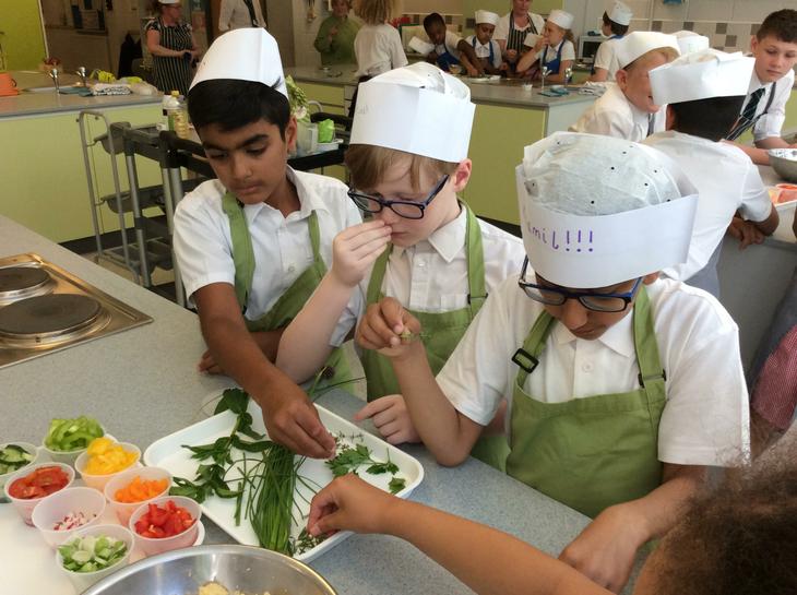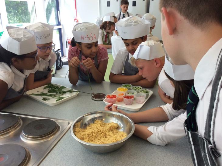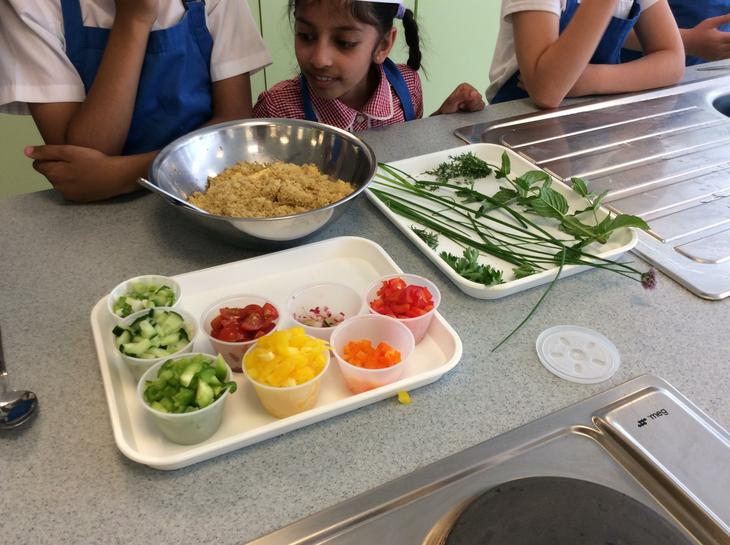 This was our first week and after seeing all the bugs that we had on our hands under ultra-violet lights, we then looked at making coleslaw and couscous salad. We used vegetables and fruits and we went in the herb garden to choose fresh herbs to put in our salads. I got to try chives, they looked like string, but when you smell them they are like onions. I used scissors and chopped the herbs and the carefully mixed them into my couscous. When I got home I shared my pot of couscous with my family. It was so good that we went to ASDA and got some couscous and peppers and then made it again with my mum for my packed lunch. (JC)