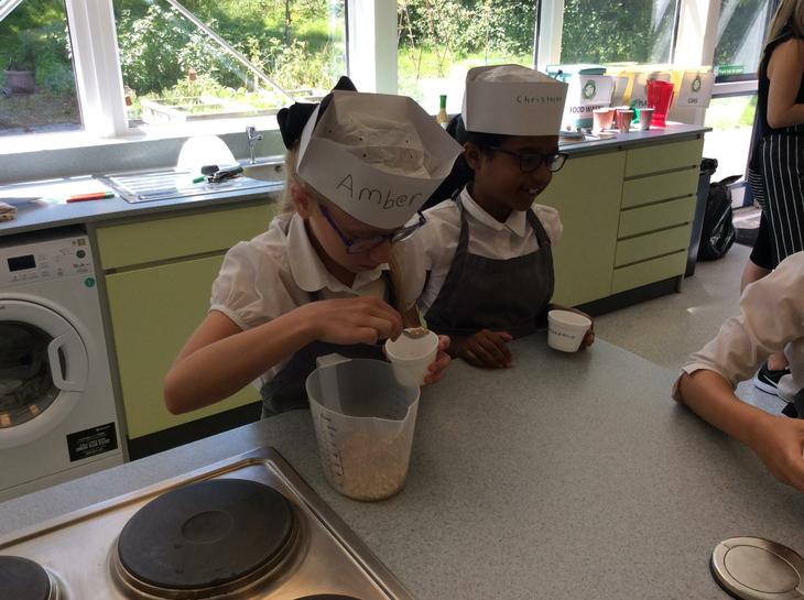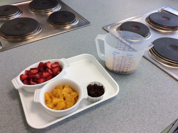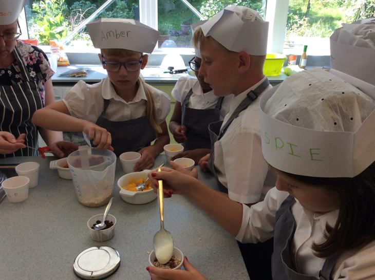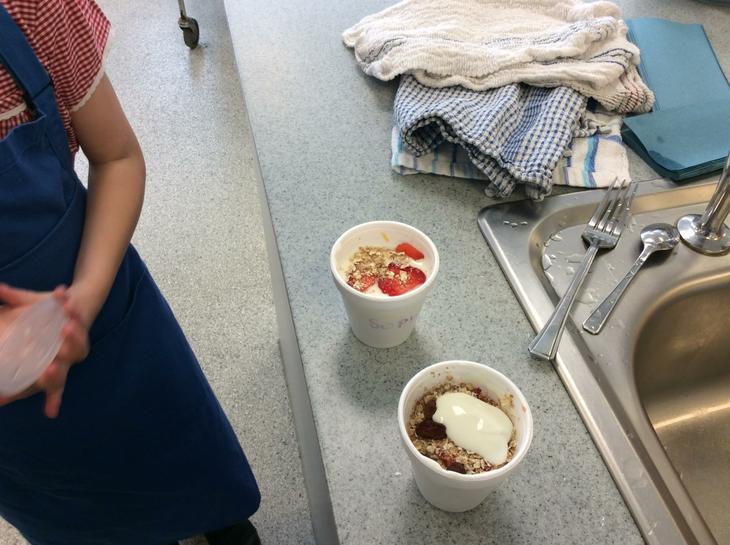 We have learning how we could use oats and yoghurt and make a special breakfast pot. Today we looked at fruit that was grown in the summer and tasted oranges, strawberries, blueberries and raisins. We then had to measure out 4 tablespoons of oats and mix it with 4 tablespoons of low fat yoghurt. The yoghurt was white and didn't have any bits in it. Then we choose one or two fruits that we would like to sprinkle on top. I choose strawberries and oranges. We mixed our ingredients together and then put the lid on whilst we made our couscous. Mrs. Newton asked us to think about and predict what would happen to our pots. I really didn't know, but I was excited to find out. She also suggested that we saved one of our pots and had it the following morning. I did and I was amazed that the fruit had changed the colour of the yoghurt and the oats had grown. It tasted really nice and now we make these at home while my mum makes tea. (ES)