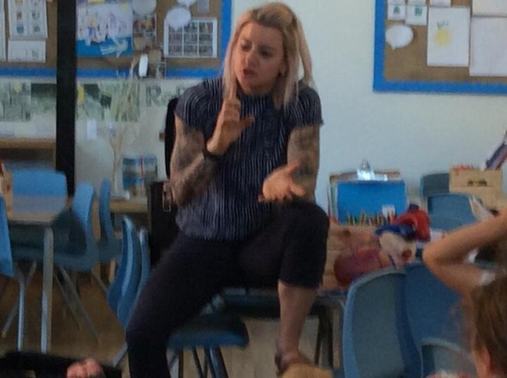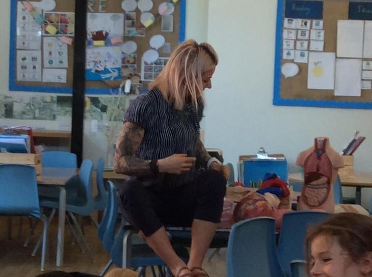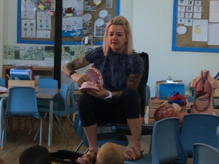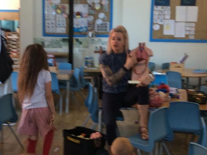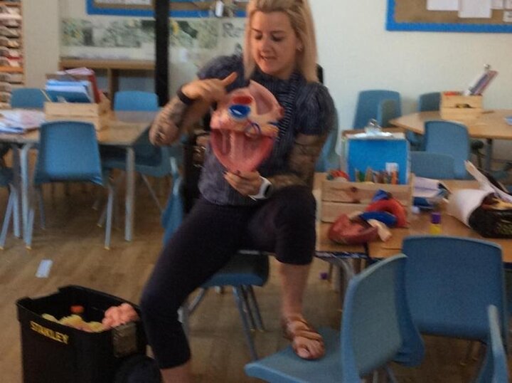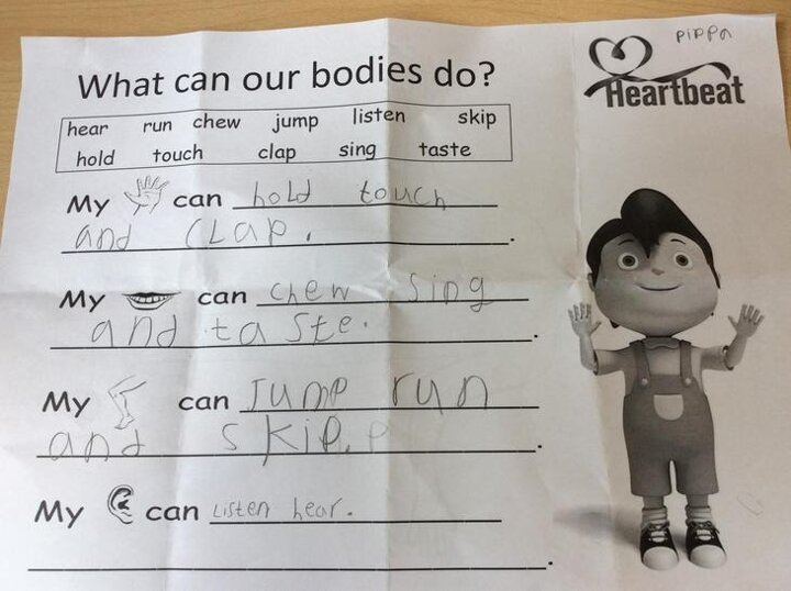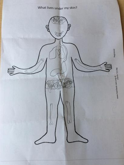We had a visitor from heart beat. We talked about where the parts of our body are. We talked about our mouth, heart and stomach and the job they do. She showed us the models of a mouth, heart and stomach. We then filled out the parts of our body on the body outline and wrote about what parts of the body do.