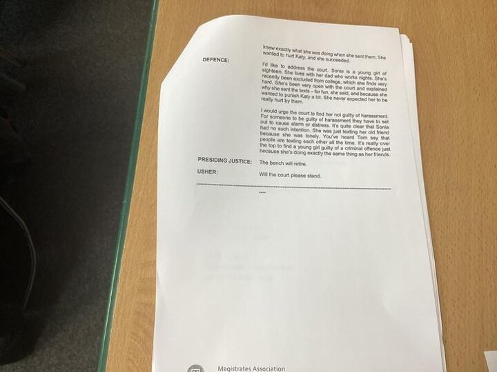 One of the children was part of the defence and asked, "I believe you go the same college as Sonia and Katy. Perhaps you’d tell me, is it common for students to send each other text messages?"