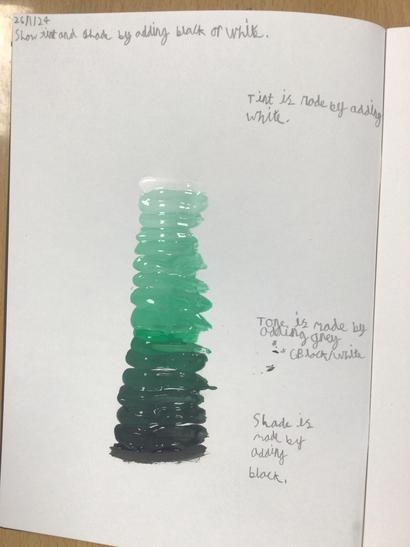 In our art, we looked at tint, tone and shade as small groups. We discussed what the differences were and how for tint we add white and for shade we add black. We then created tint and shade of a chosen primary or secondary colour and we all took it in turns mixing to create the new colour.