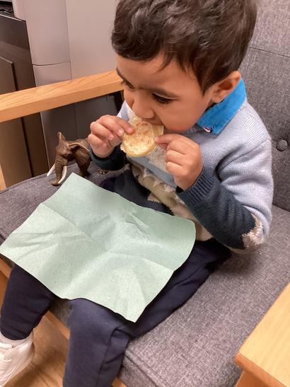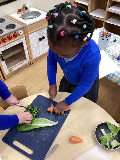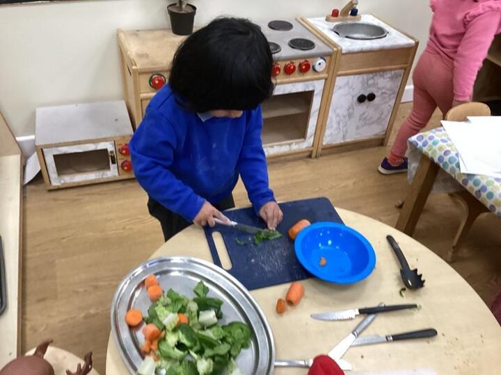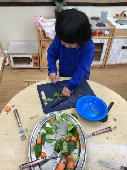 Using tools to chop and make a salad in the home corner