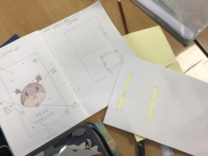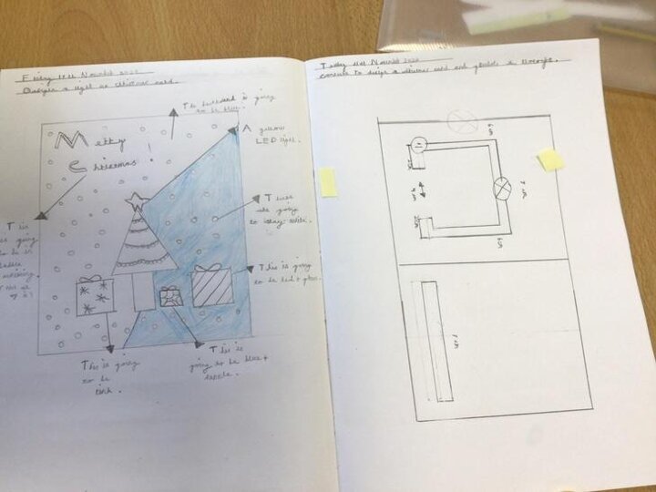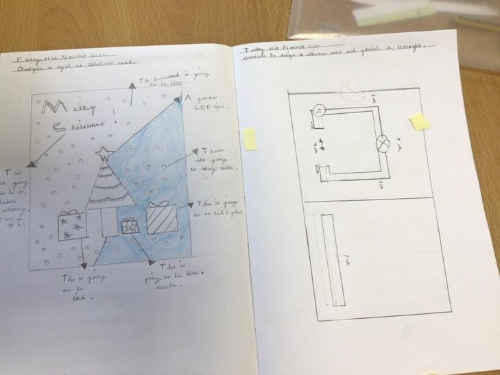 We produced our plan and prototype of what we wanted our light up card to look like. We drew, coloured and labelled our design in our books ahead of creating it for the real thing.
