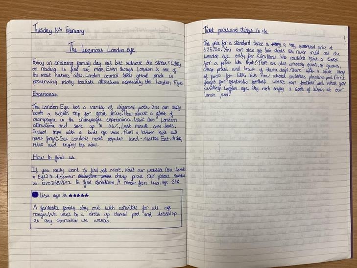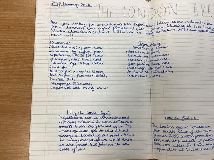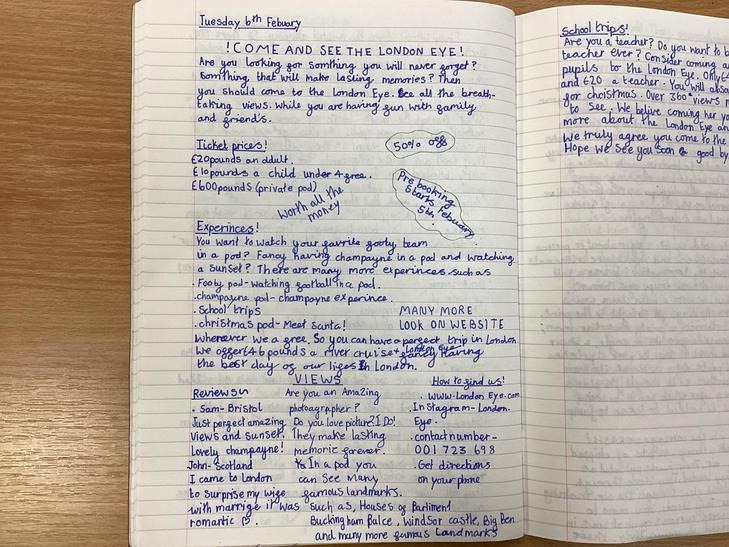 Linking to our class novel, we have planned and written our own persuasive leaflets based on The London Eye. Please have a read of our work below.