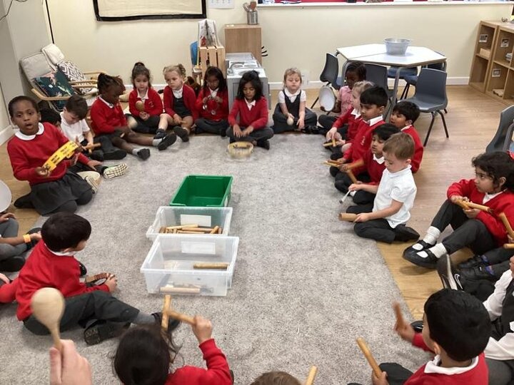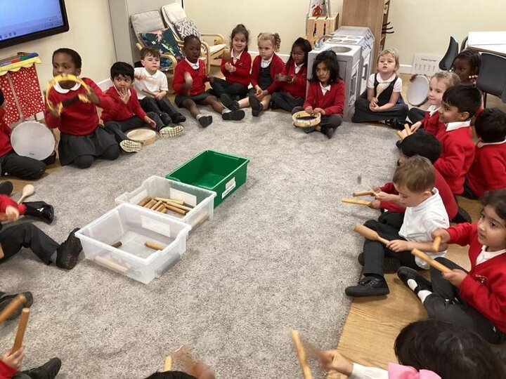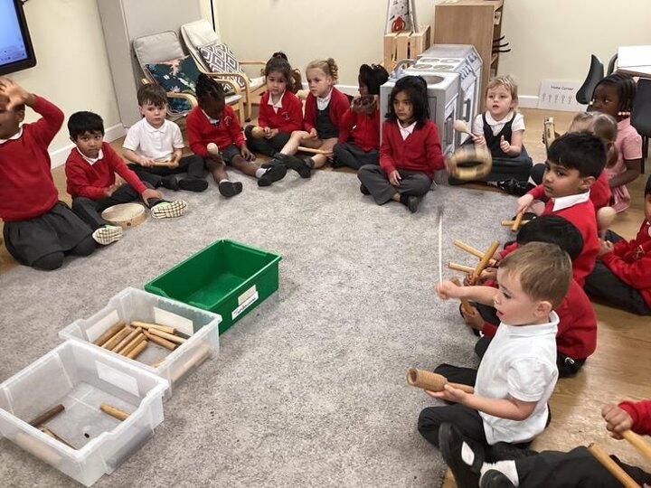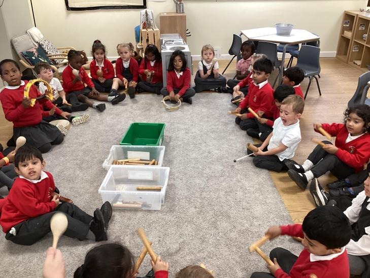 The children used the instrument to sing their favourite nursery rhymes in time. We introduced the word beat and rhythm. We also talked about what we were doing to the instruments to make them play.