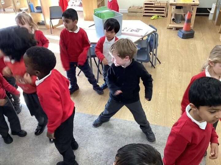The children were listening to the Alton Towers theme tune. They were responding to it by moving their bodies.