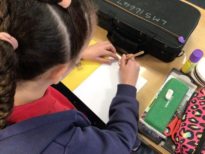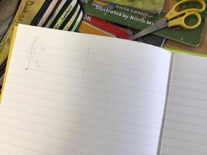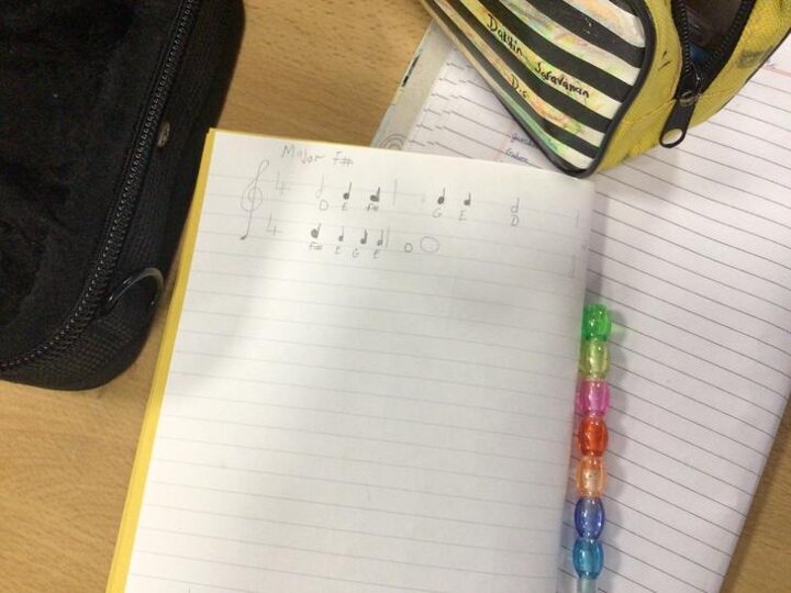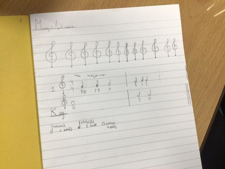 Independently writing our own bars of music and writing the letters in to help us with our notes for playing.