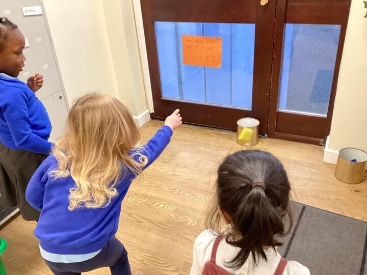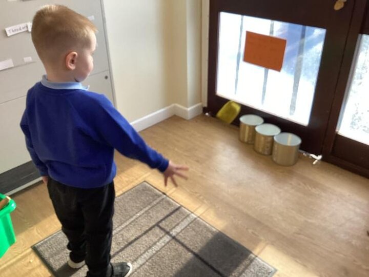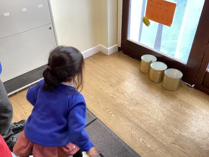 Nursery have been practising underarm throw, throwing beanbags into pots.