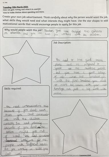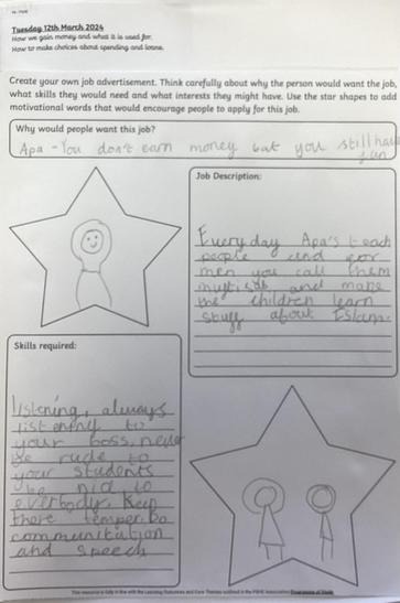 We discussed how people gain money and that people choose different jobs for different reasons. We chose a job that we were interested in and shared the jobs they would need to do on a daily basis and what skills they would need for that job.