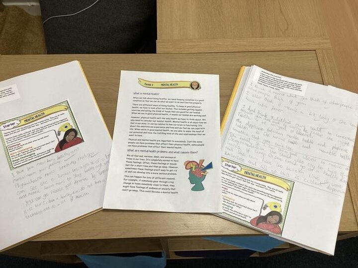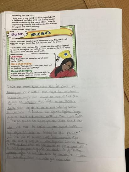 We have been reading different stories about how mental health might affect people. The children have used the information within the texts to advise fictional characters on what they can do to improve their mental health and why this might be different to their physical health.