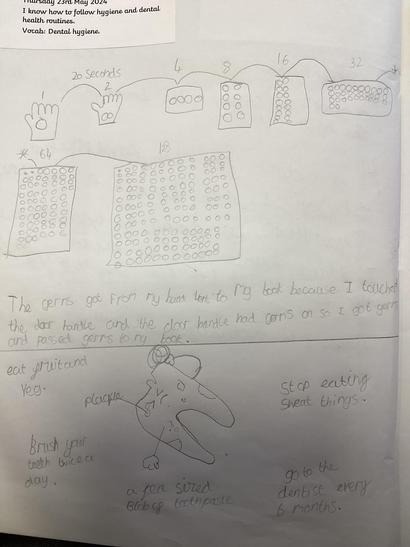 This week we have been looking at hygiene and the importance of washing our hands properly. We have investigated how germs can travel to different areas of the room through touch and how they can multiply quickly.