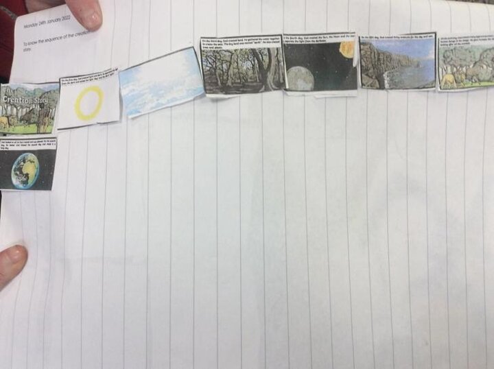 We listened to the creation story. We then ordered the pictures of the Creation story.