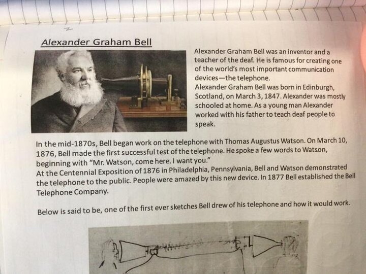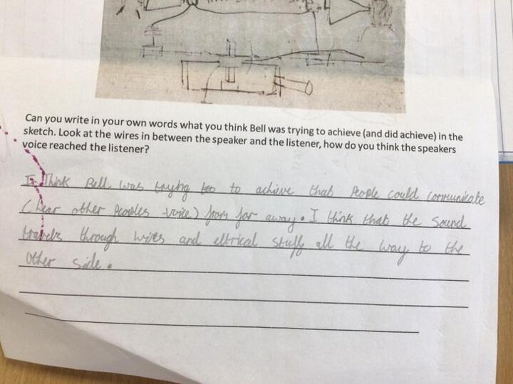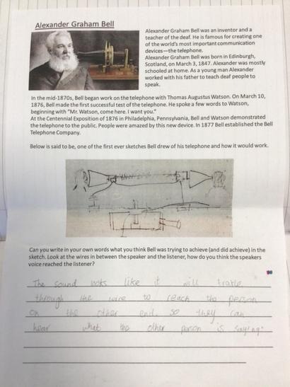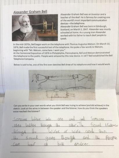 At the start of our sound unit, we read about Graham Alexander Bell and what he was famous for. We read through the short text and then we answered the questions about how we thought his first telephone worked.