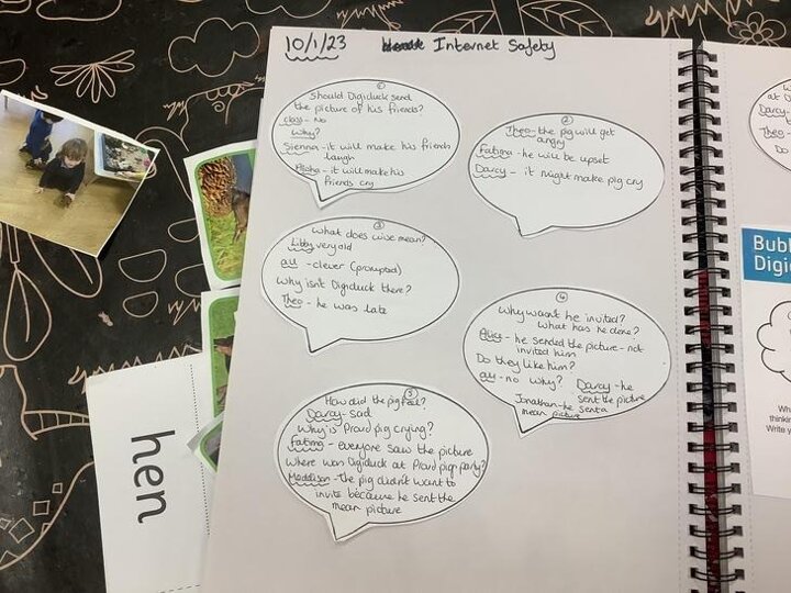 Reception read the story of Digiduck’s Big Decision and we talked about the affect Duck’s decision had on his friends. Digiduck saw a funny picture of his friend pig and was going to post it online. The wise old owl talked to him about what would happen if he did post it and what affect that would have on his friends and relationships.